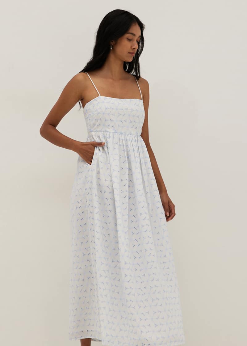 This versatile dress is an excellent addition to your wardrobe basics. You can dress it up for a glamorous party — bring out the dainty jewelry, put your hair up, and pair it with your favorite sandal heels — or put it on for everyday wear with your pair of trusty sneakers and cropped denim jacket. This maxi dress is crafted from cotton broderie and features a babydoll silhouette with a straight neckline camisole bodice. And the best part? It has functional side pockets!