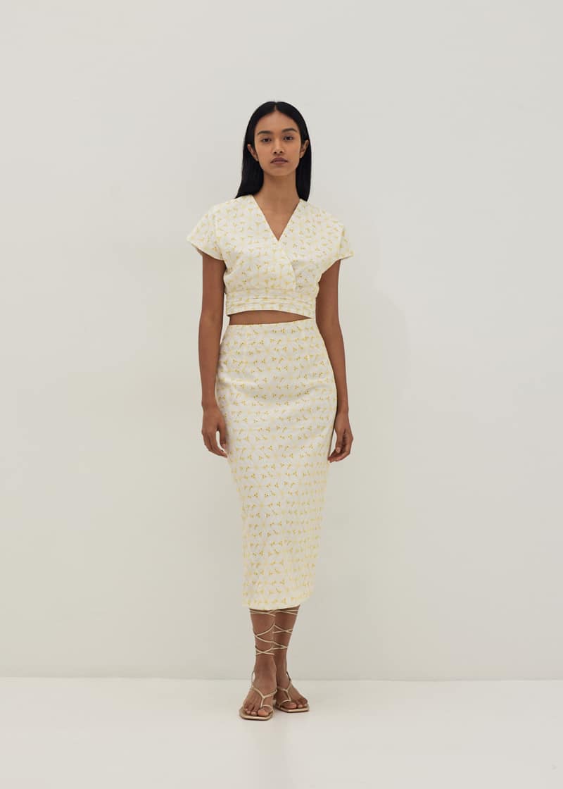 You can get the Gloria Broderie Front Wrap Top and Column Skirt in White and Daffodil from sizes XS to XL.