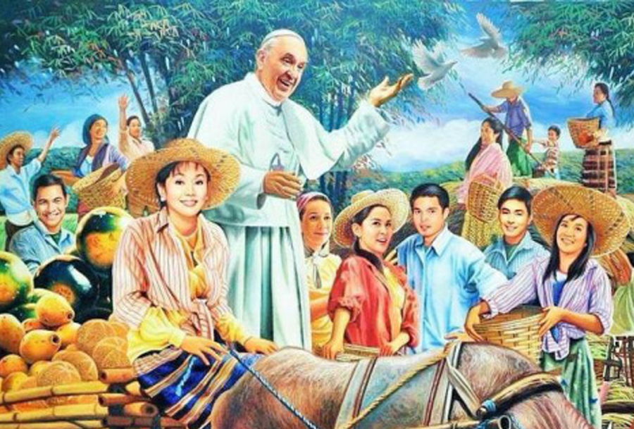 Entitled “Salubong,” Hipolito’s work depicts the pontiff with a number of Filipino celebrities and politicians such as Kris Aquino, Marian Rivera, Dingdong Dantes, Senator Grace Poe, and Governor Vilma Santos. It circulated in social media earlier this week, and instantly sparked widespread debate and conversation. A lot of different reactions and strong feels quickly multiplied online.